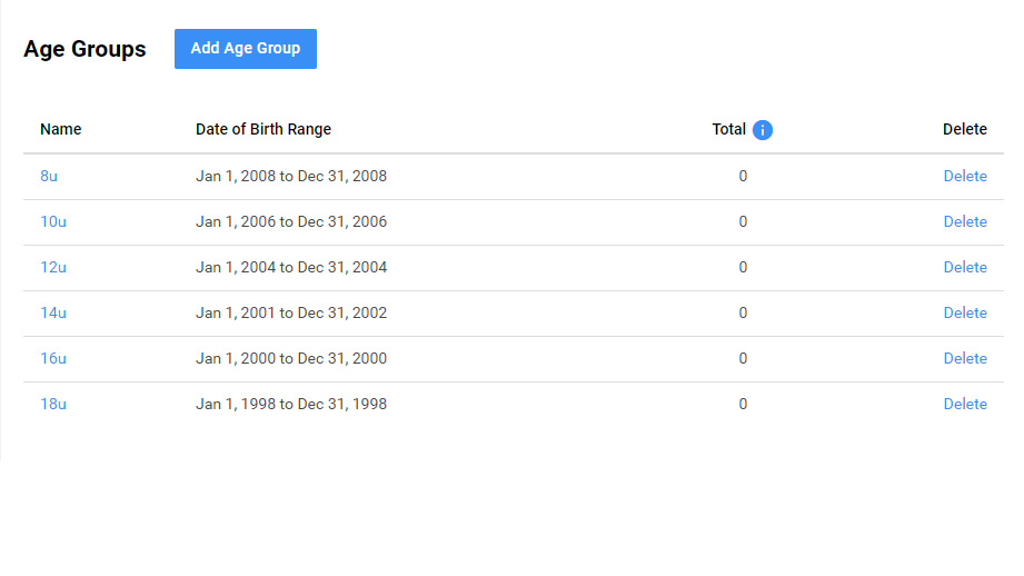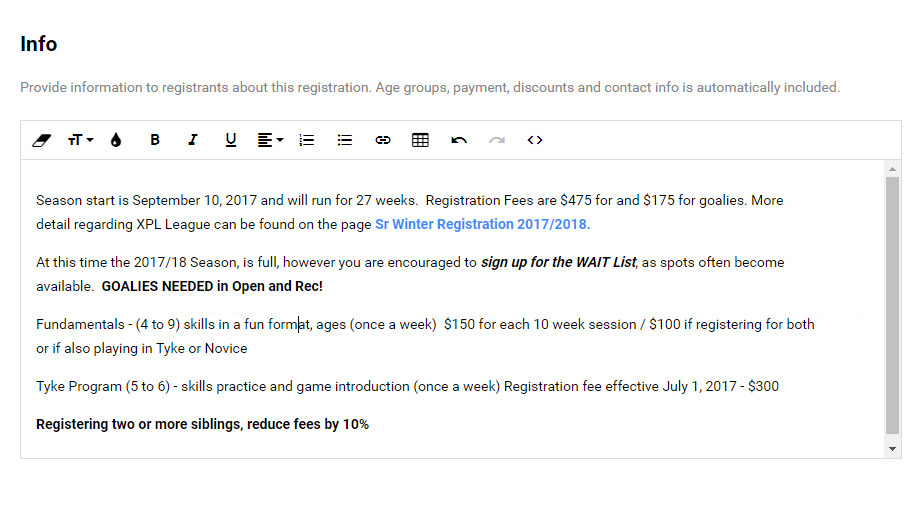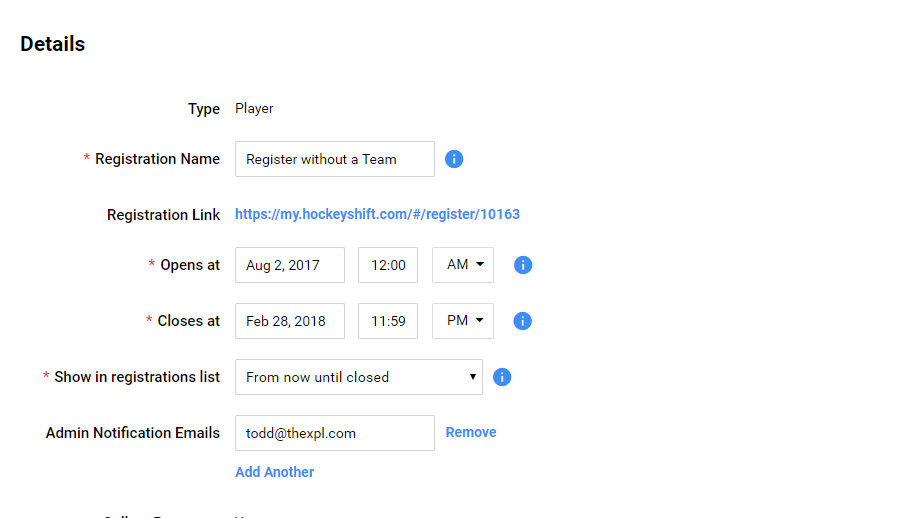 Configure your registration with options like type, stats options, open and close dates and payment options.